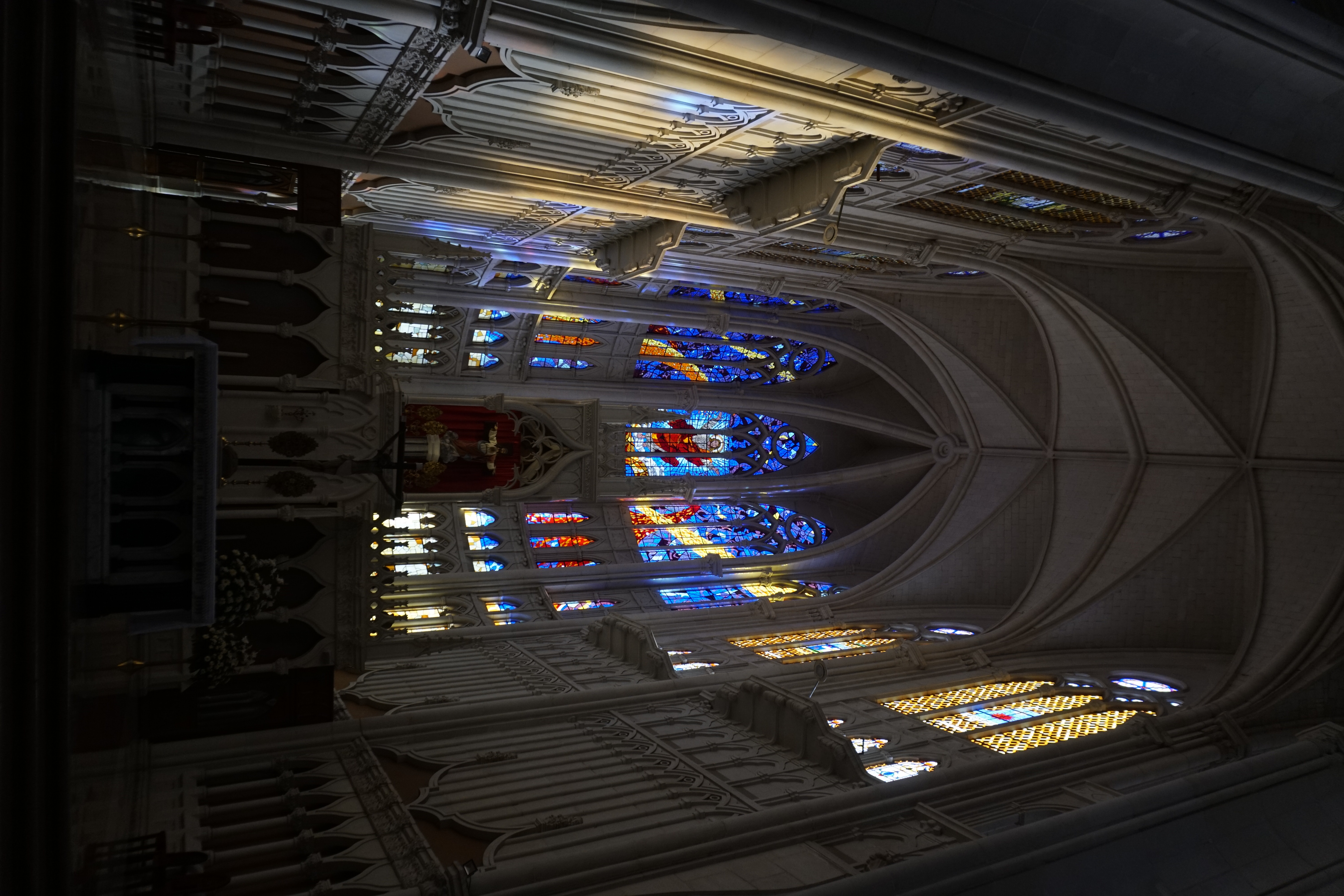 Vitrales del Templo Expiatorio vistos desde el interior. En el presbiterio destacan múltiples elementos típicos del estilo neogótico, como los arcos ojivales, las líneas verticales de las columnas, las nervaduras de los techos y los enormes ventanales cubiertos con vitrales de colores que tienen como motivo principal la imagen del Cristo Rey del Universo. Los vitrales fueron elaborados en los talleres de Rodolfo Gutiérrez en Encarnación de Díaz, Jalisco. En el altar principal destaca la escultura de bulto del Sagrado Corazón de Jesús a quien está dedicado el templo; 2025. Autor: Mario Armas.
