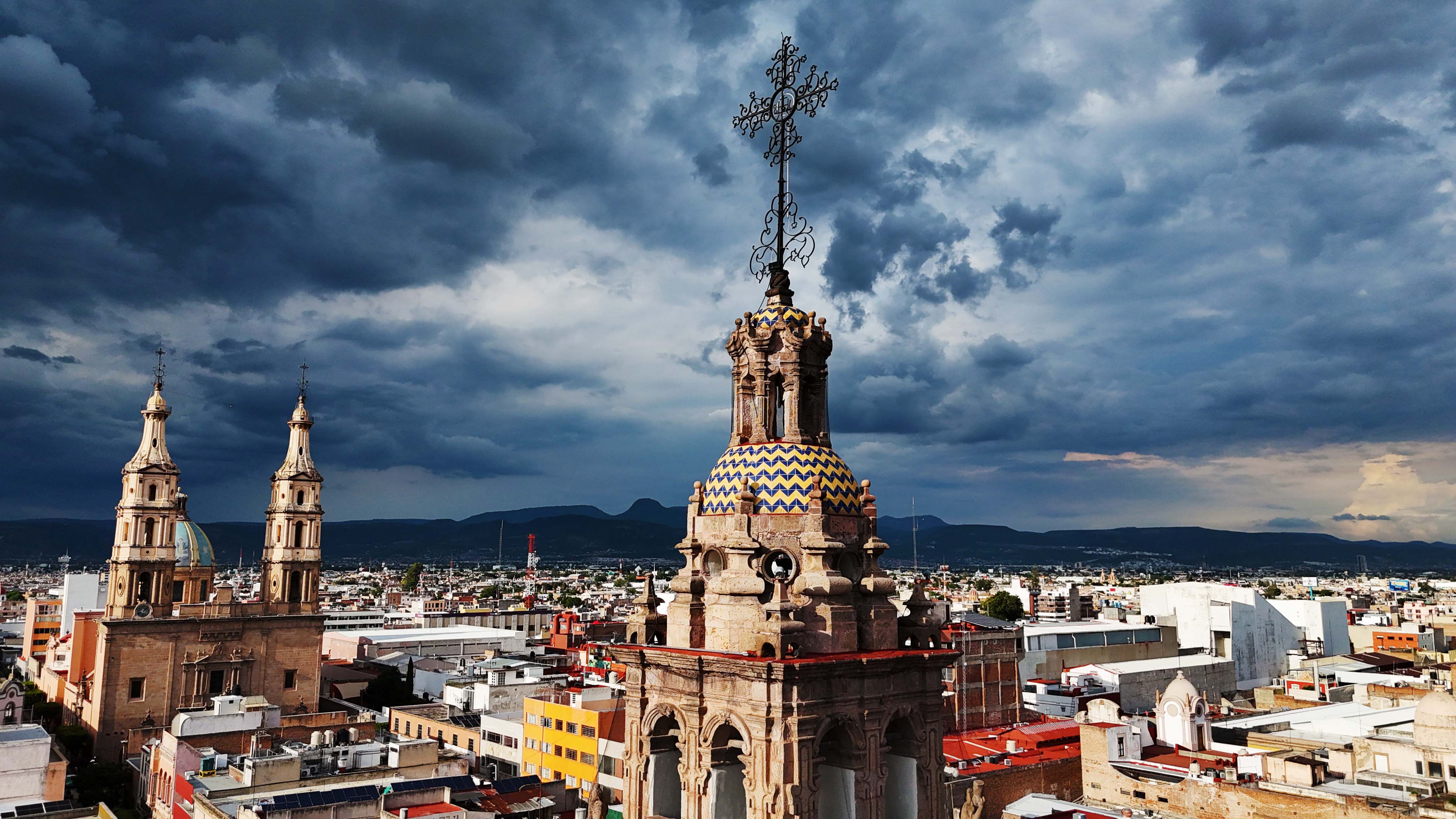 Torre de la Parroquia del Sagrario y fachada de la Catedral Basílica. Vista panorámica de León hacia el nororiente, donde se observan la fachada y las torres de la Catedral y al fondo la serranía y el cerro del Gigante. En primer término, el remate de la torre barroca de la Parroquia del Sagrario; 2025. Autor: Mario Armas.