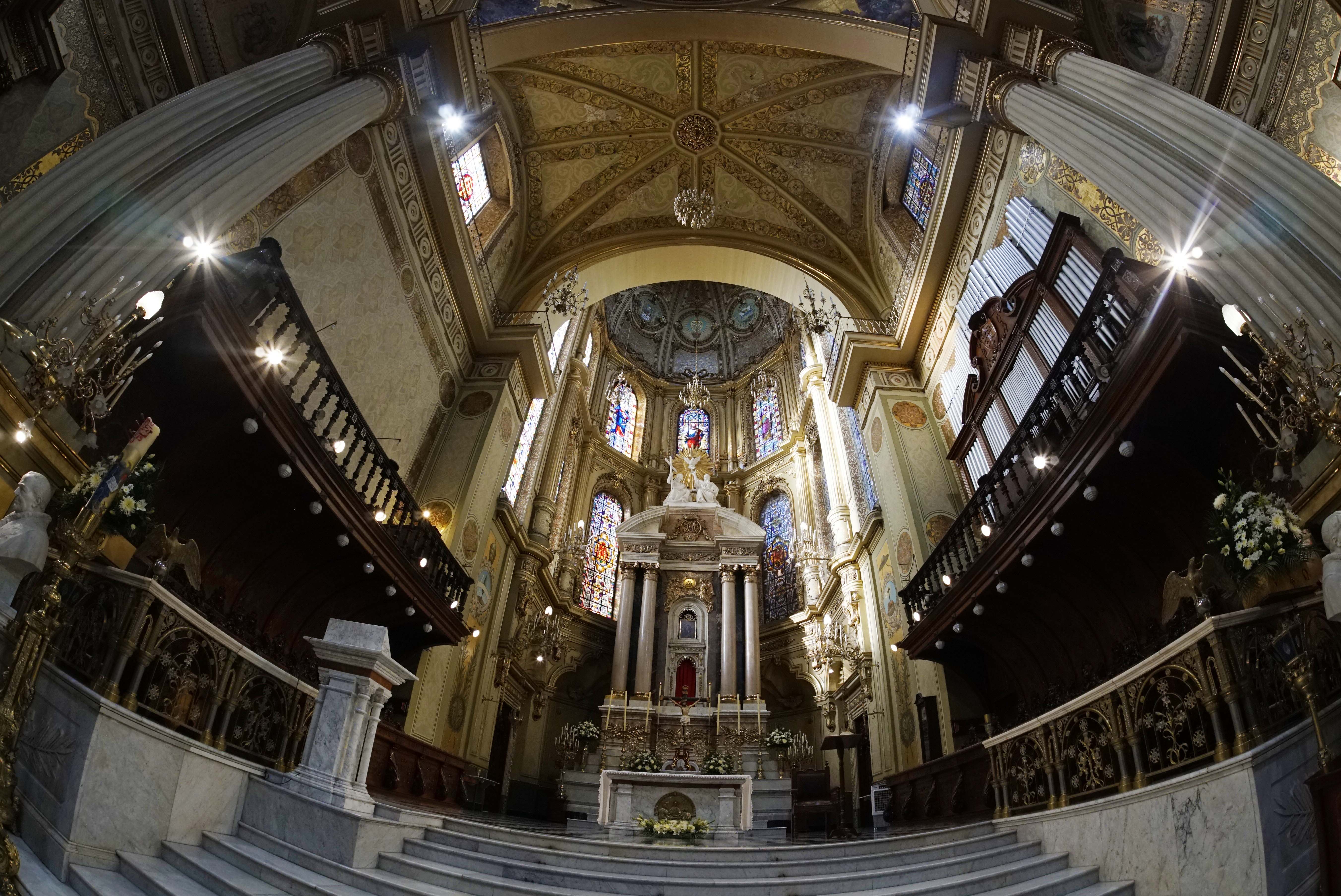 Presbiterio de la Catedral de León con efecto ojo de pez. El presbiterio contiene en sus laterales un gran coro de madera y un órgano tubular monumental. La cátedra y el altar mayor están hechos en mármol. El retablo mayor, construido con diversos tipos de mármoles y metales, se encuentra rodeado por grandes ventanales con vitrales alemanes; 2025. Auto: Mario Armas.