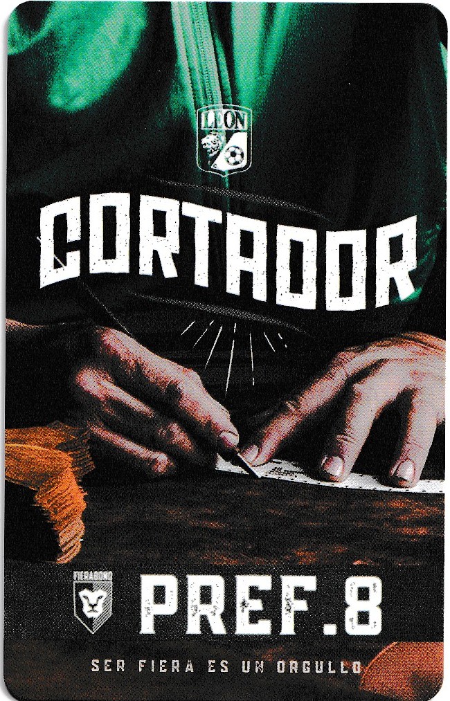 Tarjeta de acceso para abonados en zona Preferente, puerta 8 del estadio León, correspondiente al Torneo Apertura 2023. Las diferentes especialidades de los zapateros, como en este caso el cortador (de la piel), ilustran los distintos Fierabonos que se utilizaron en dicha competencia. En esta edición se agregó la leyenda “Ser fiera es un orgullo”. Fotografía: autor desconocido.