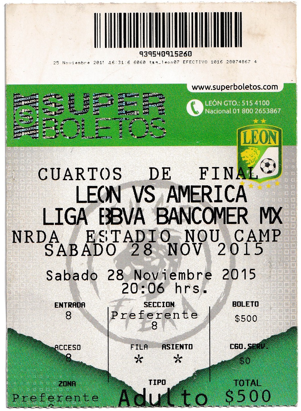 Boleto impreso para el partido de vuelta de los cuartos de Final del torneo Apertura 2015, sección Preferente, puerta 8, León vs América, 28 de noviembre del 2015. Los verdiblancos ganaron el encuentro pero fueron superados en el marcador global.