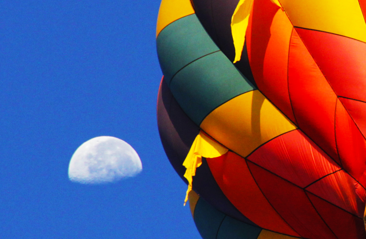 Detalle de globo aerostático colorido y luna de fondo durante el Festival Internacional del Globo, FIG 2019. Autor: Mario Armas. 17 de noviembre de 2019.