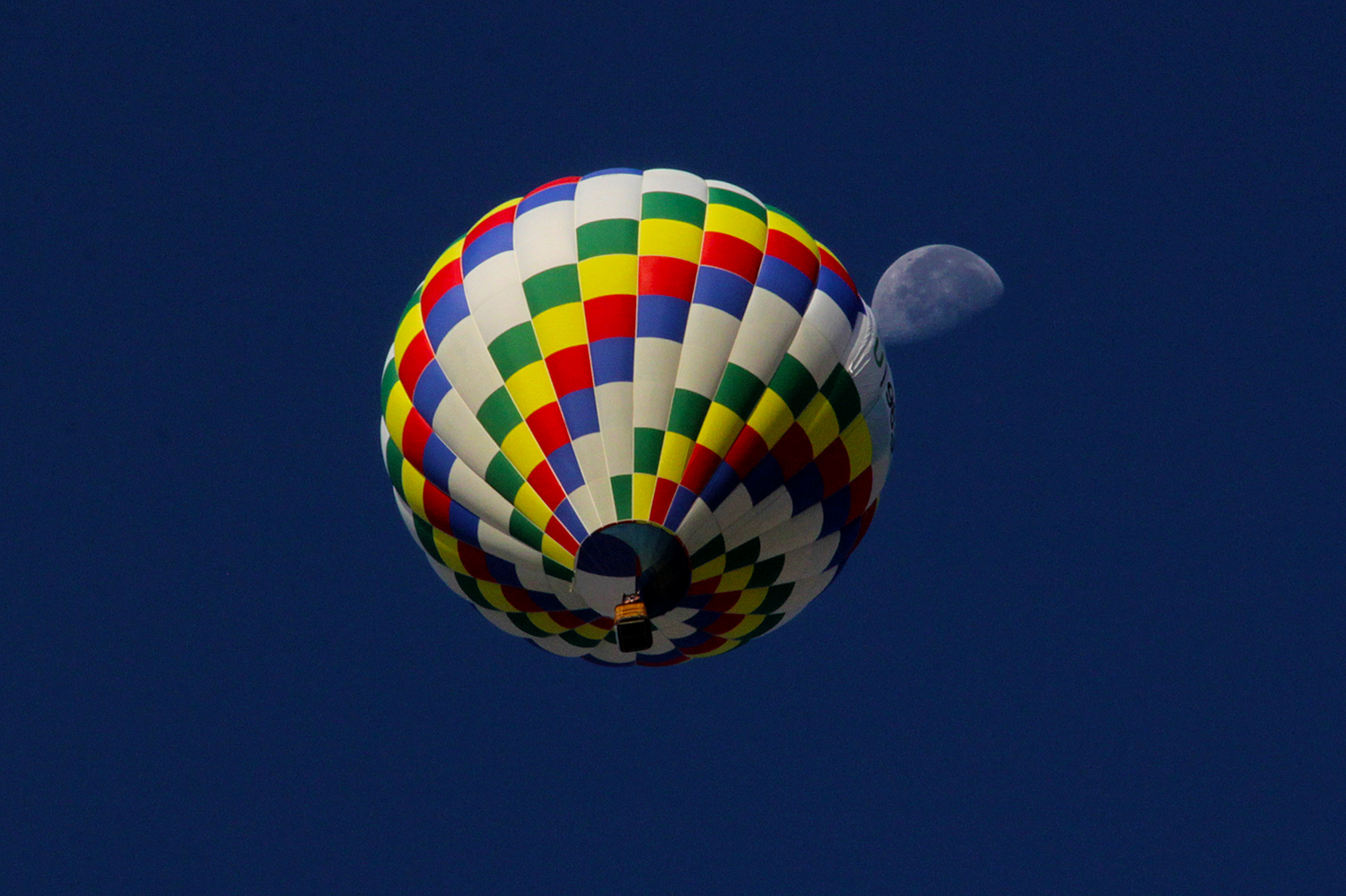 Despegue de colorido globo aerostático y luna de fondo; Festival Internacional del Globo de León FIG 2019. Autor: Mario Armas. 17 de noviembre de 2019.