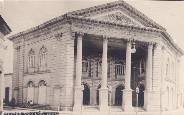Fachada completa del Teatro Doblado con los laterales y el pórtico principal, con tres escalones sobre la banqueta. Se distinguen las cuatro antiguas farolas de luz de arco sobre la banqueta frontal. Un sello en la parte posterior indica que esta postal fue vendida en la papelería “La Estrella”. Propiedad de Everardo Gómez. Autor: Atribuida a Charles B. Waite. Medidas: 0.5 x 14.8 cm; ca. 1910.