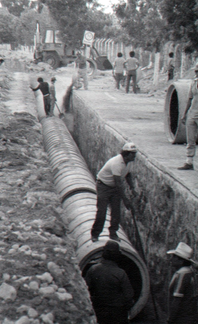 Un grupo de trabajadores ajusta los tubos de un colector del drenaje pluvial. A finales del siglo pasado, SAPAL instrumentó un gran programa de obra para ampliar esta red e interconectarla, lo que permitió eliminar paulatinamente el riesgo de inundaciones. Fotografía en blanco y negro; ca.1988. Autor: Ramón Malacara.