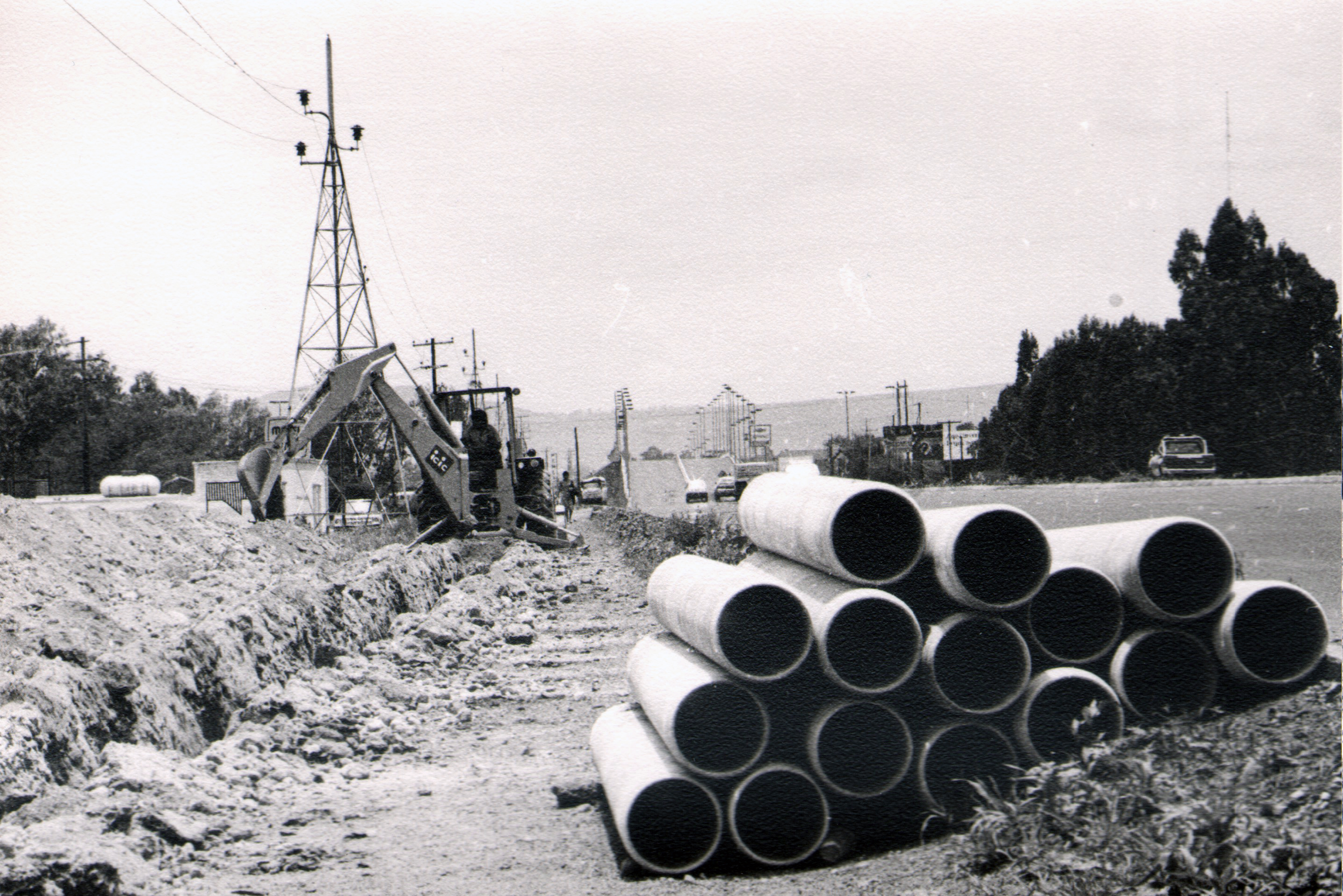 Obras de la extensión del servicio de agua potable a un costado del bulevar Aeropuerto. El proyecto de La Muralla permitió garantizar el servicio diario en casi todas las colonias del oriente de la ciudad. Fotografía en blanco y negro; ca.1989. Autor: Ramón Malacara.