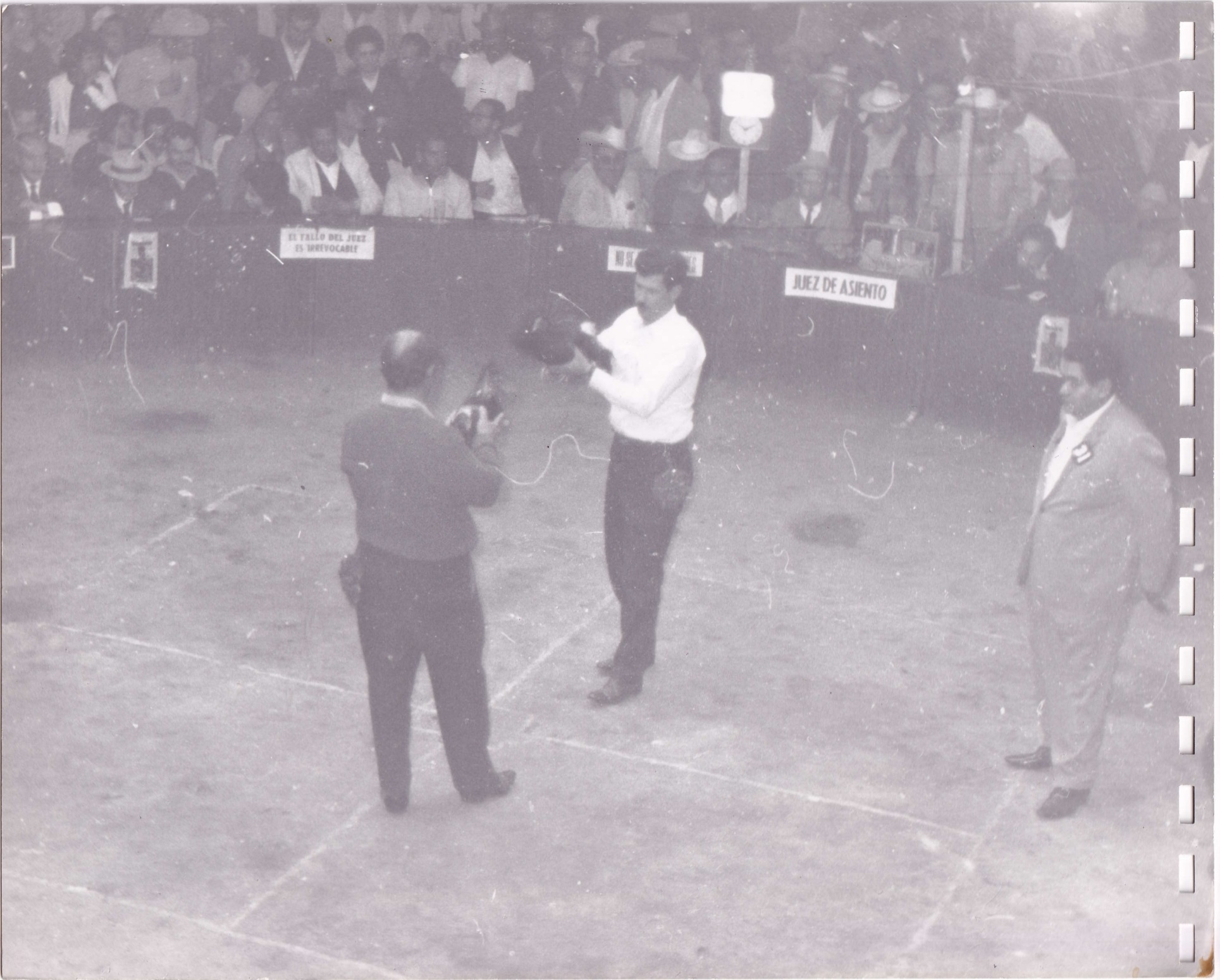 Dos galleros se disponen a empezar la pelea en el ruedo del palenque de la Feria de 1965, instalado en la Arena Isabel. Impresión en blanco y negro sobre acetato tamaño carta. Autor desconocido.