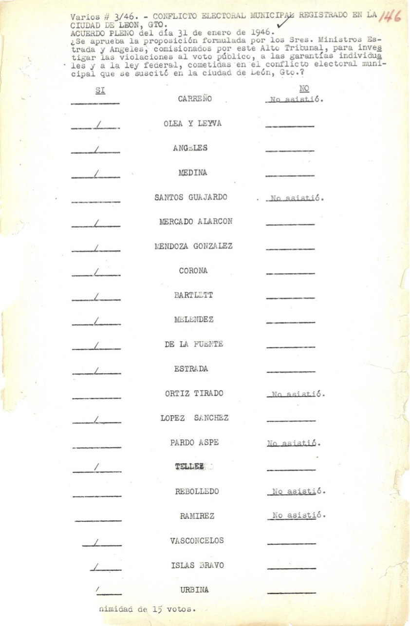 Constancia de la votación de la Corte para la investigación de violaciones al voto público y a las garantías individuales cometidas en el conflicto electoral municipal que se suscitó en León, Guanajuato en 1946
