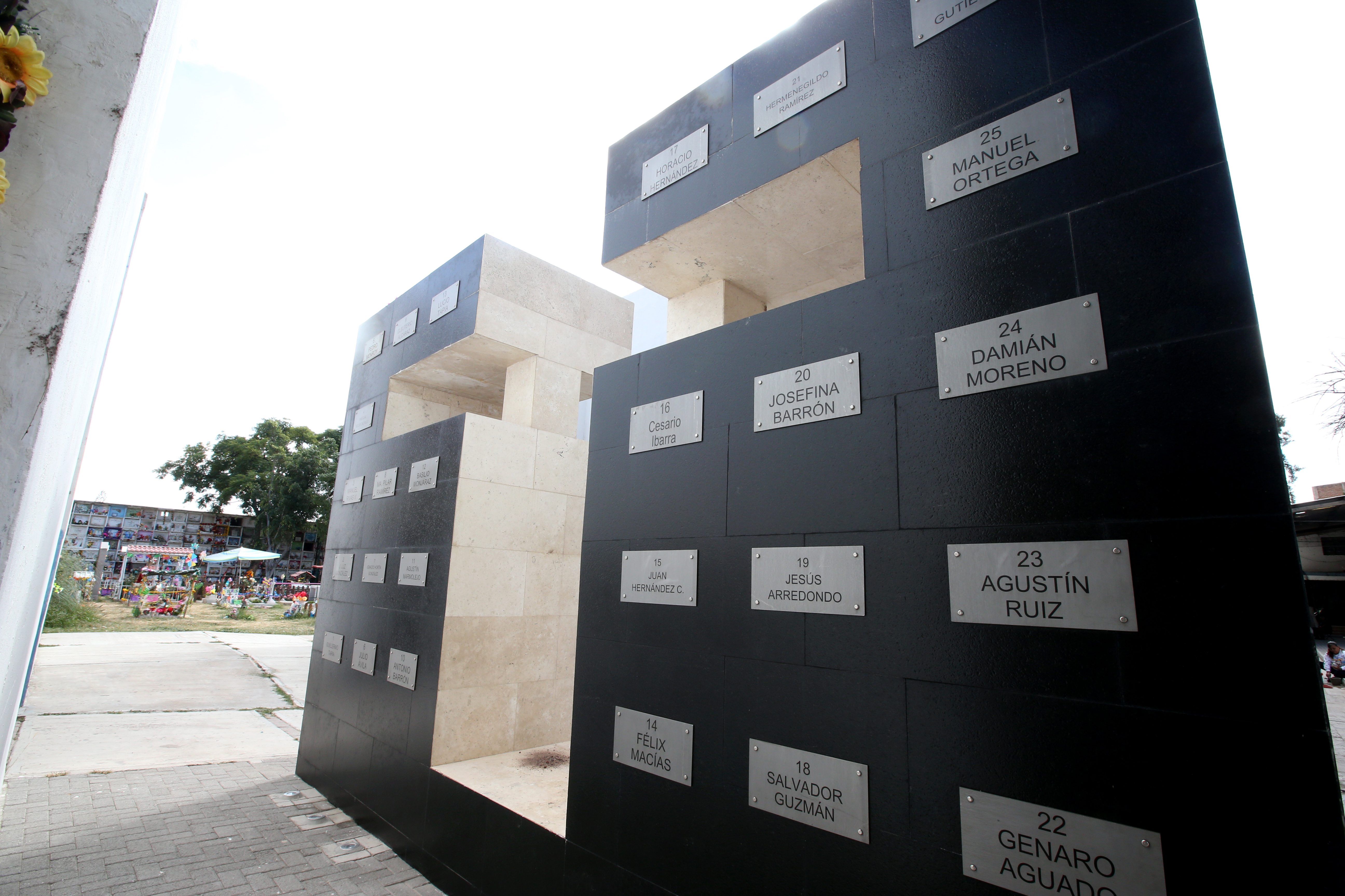 Sepulcro de los mártires del 2 de Enero, en el interior del panteón San Nicolás. En dicho monumento se instalaron placas de acero inoxidable para asegurar que los nombres de las 26 víctimas que descansan en dicho sepulcro perduren a través del tiempo. Autor: Mario Armas. Año: 2025.