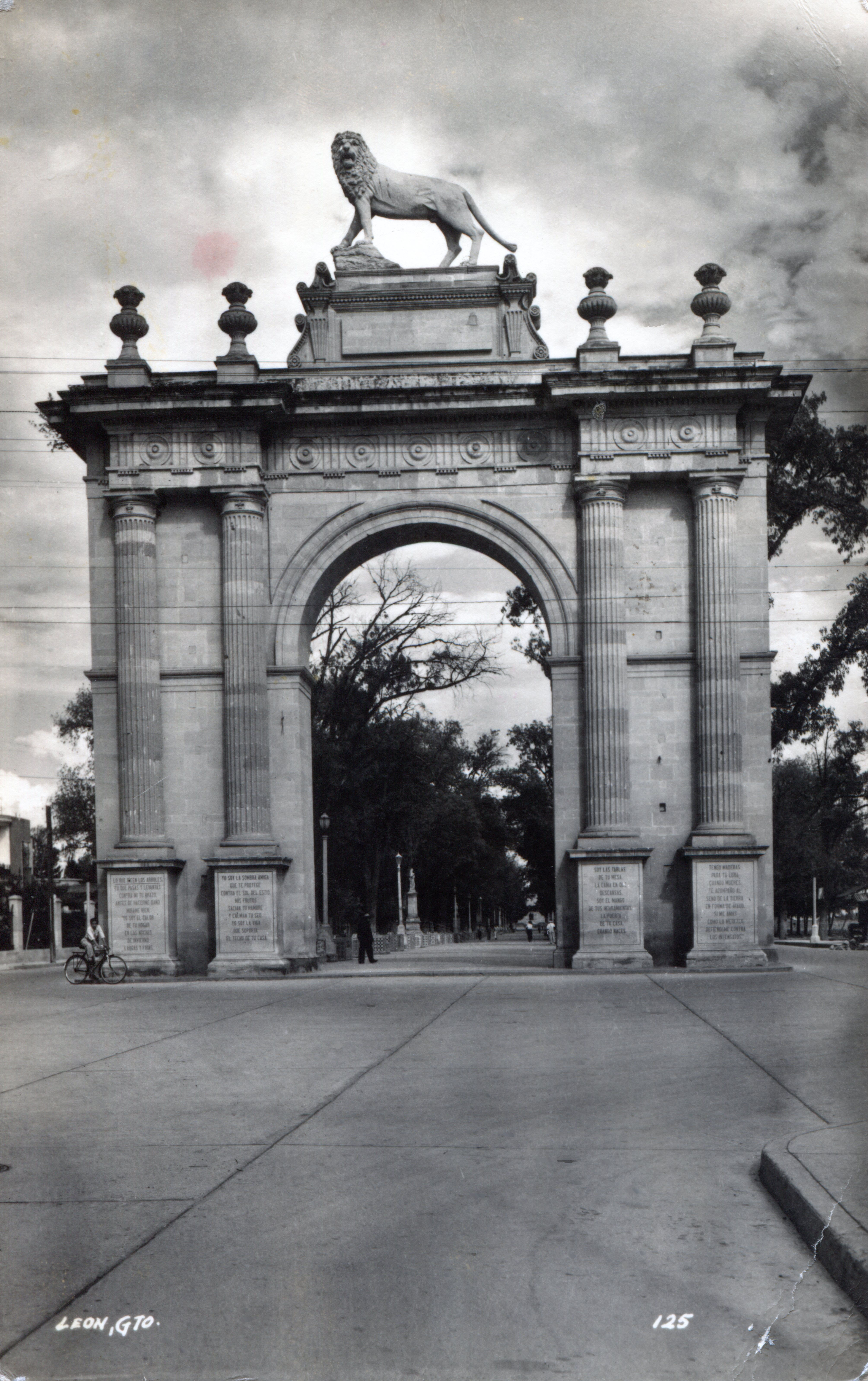 Postal del Arco de la Calzada número 125. La primera versión del león data de 1942. El entorno se pavimentó llegando a la mitad del siglo XX. Medidas: 8.72 x 13.89 cm. Autor desconocido.