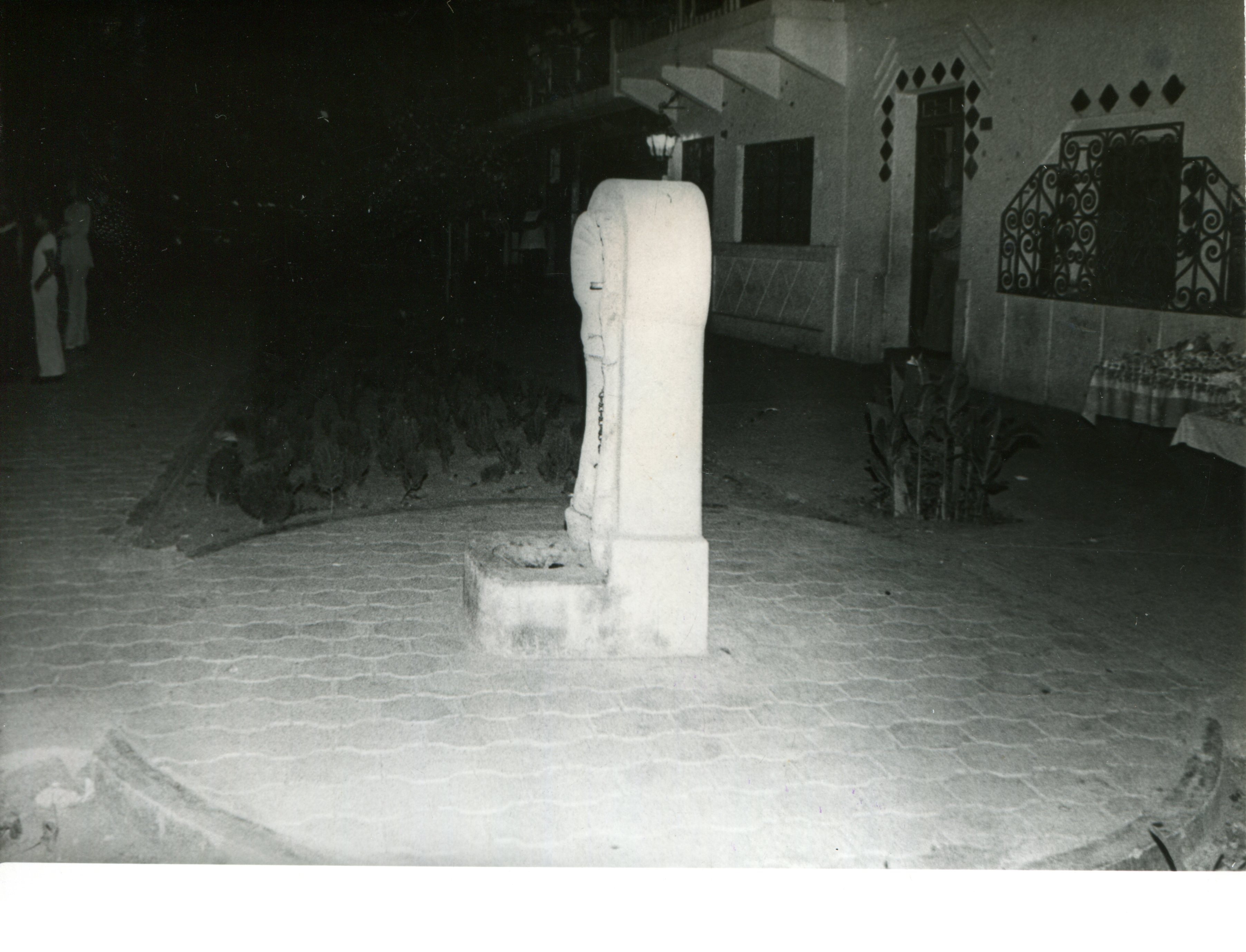Antiguo hidrante de cantera que surtía de agua a San Juan de Dios; formaba parte del sistema de distribución del agua que trazó Louis Long entre finales del siglo XIX y principios del XX. Ubicado al final de la calle Altamirano, es el único que se conserva en León a la fecha. Fotografía en blanco y negro, sin autor identificado, c.1974-1976.