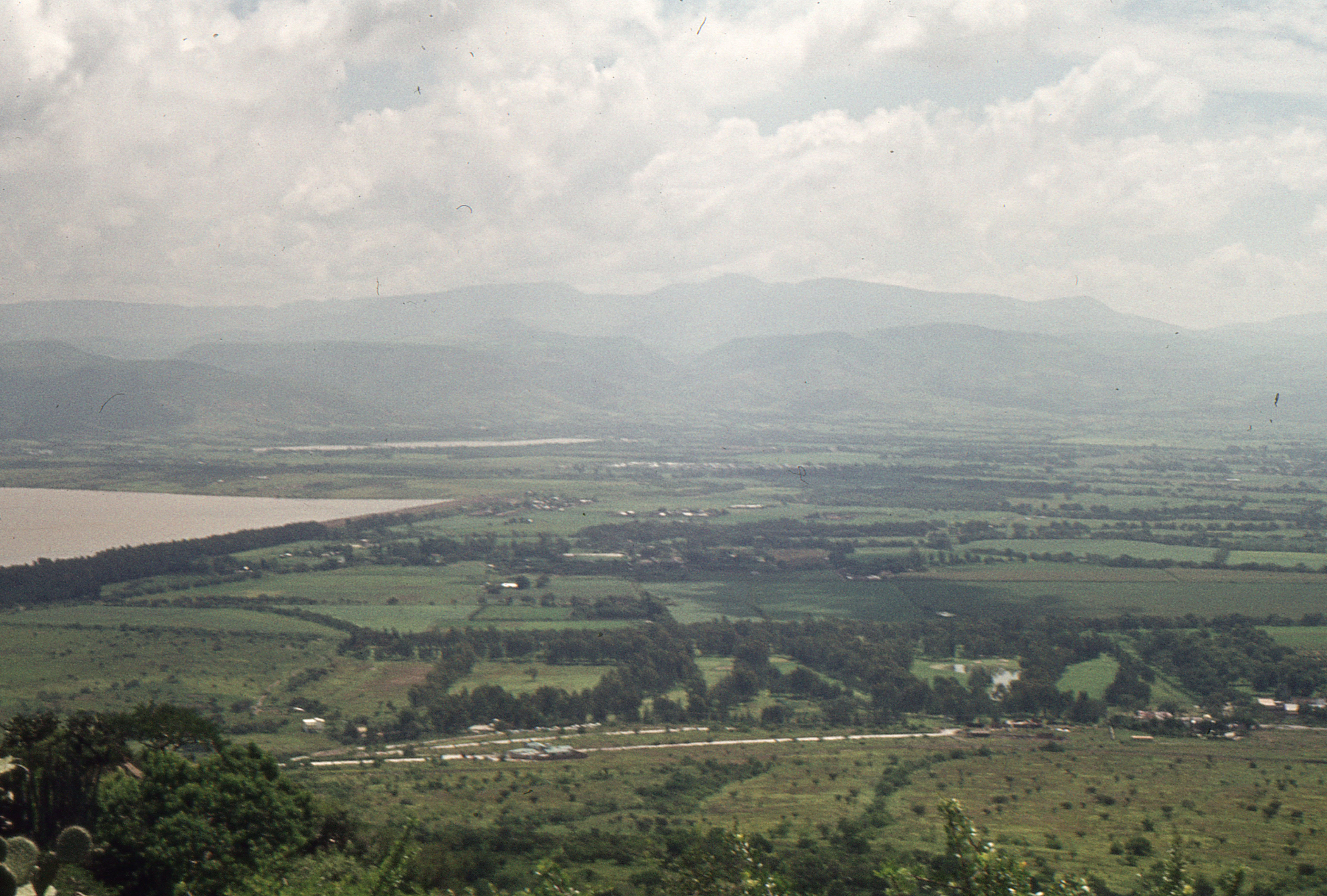 Presas El Palote (a la izquierda) y Echeveste (al fondo) vistas desde el cerro Gordo. La arboleda al centro enmarca el campo de golf del Club Campestre. Diapositiva en color; c.1972-1974. Autor desconocido.